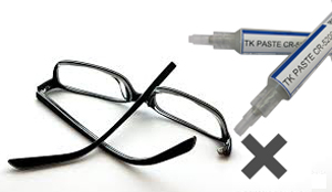 メガネの修理の急場しのぎに、よく瞬間接着剤を使用するお客様が多く、「直して下さい」と持ってきますが、接着剤使用は絶対やめてください。接着剤を取り除く時のことを考えて観て下さい。焼き取る、または丁寧に削り取る方法しかありません。メガネはご承知のように、セルフレーム、メタルフレームなどがあり、硝子レンズ、プラスチックレンズ、それに付属部品が多くついています。たとえメタルフレームにしても、、焼けば炭素跡が黒く残ります。金属は良いとしても、ガラス、プラスチック、カラー等々に火が廻れば当然お解りのはず。直るものも直りません。自分の不注意により、曲がったり折れたり、ロウ離れするのは当然です。愛着あるメガネを長持ちさせたければ、接着剤は絶対にだめです。