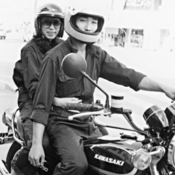 kAWASAKIの750に乗って、黒のアドバンのつなぎを着てもう言うことなしといった感じの市内在住のとおる君とかなえさん。