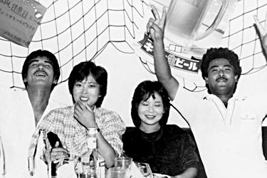 左から柴田輝幸さん(19才)中村晃子さん(18才)兼子浩之さん(18才)鎌倉久美子さん(19才)今日は女の子と話が出来て感動!と柴田さん。僕ら名古屋の愛知学院大学って書いといて、推薦で入った。と兼子さん。バレーの推選で入ったくせに、このやろ〜と柴田さん。女子2人はパイオニアに勤めています。