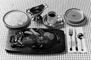 スープ、炭焼きハンバーグステーキ、ライス、コーヒー(または紅茶かバニラアイス)をコースでお楽しみ下さい。素敵な「一流メーカーコーヒーカップ&ソーサー」をプレゼントいたします。
