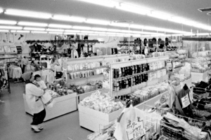 今一番ナウな机はユニットデスク。無駄なくスペースが生かせ、組合わせ自由なユニットデスクは種類も豊富。真中に棚をもってきて左右に机を取付ければ2人用になるという机。お子様の洋服は、学校から帰ったらすぐに着替えられるようにロッカーが付いている。はたまた狭いスペースを生かすように上をベッドに出来るデスクもある。自分の幼い頃から比べればなんとまあうらやましい。ジャスコ推薦のコンポデスクは部屋の構造によって机を右に持ってきたり左にしたり、簡単な付替え操作で自由にレイアウト。写真の商品は63,800円でチェアは別売り13,500円。4階新入学コーナーでは机の他に、ハンカチ、筆箱、鉛筆など必要な物がぎっしりセットされている文具せっとなども展示されている。値段もお手頃な2,800円から各種揃っいて、入学祝い商品としても最適。この他、ジャスコ4階には新一年生のための必需品がいっぱい! (お店スポット1981.3)