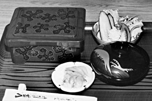 最近ではおせち料理もパック詰めで売られているが、何か物足りない。所詮インスタント食品。せめて新年には手作り料理で豊かな気分でスタートしたい。掛川スーパーでは正月用品のコーナーを設けてあるので新鮮な野菜からお正月料理に必要な材料がほとんど揃っています。好きな材料が揃ったら料理本片手に仕上げましょう。途中のつまみ食いも楽しい。お正月は家庭に平和な雰囲気がただよっていて、めでたしめでたし。一人暮らしの方も、せめて2、3品は手作りの料理を! (お店スポット1981.12) |