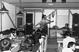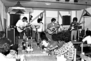 夏も終わろうとする8月24日に、ライブハウスが掛川に誕生!ともかく掛川にライブスポット!というのだから大変なもの。静岡県下でも指折り数える位で、都心から離れたこの辺では「ライブハウスって何?」というぐらい静岡〜浜松間にはライブハウスという名の店は1軒もなかった。ひょうたん島はVサイン一つで気軽に入れるライブハウス。昼は11時から食事も出来る。JBLスピーカーからはロック、フュージョン、フォークなどが流れリクエストもOKだ。土曜 ・日曜の夜にはアマチュアバンドやプロをゲストに迎え熱いライブステージが開催される。ライブが無い時にはレコード演奏をはじめ、フィルムコンサートや自主上映映画、それに演劇なども企画している。今までの喫茶店ともスナックやパブとも違う、ライブハウスひょうたん島。カウンターも有り、お酒も飲めるので楽しくなりそうだ。9月に入り最初のプロのライブは26日(土)には知る人ぞ知るあの南正人さんが出演する。