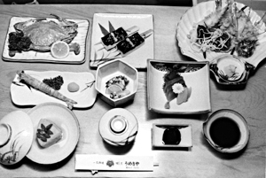 新鮮な海の幸が6〜7品がついて、一名様¥3,000から宴会が出来る。どんな料理をどれくらいにするか、酒を何本つけるかは幹事さんの交渉次第。写真の料理は¥5,000コースで、天ぷら、刺身、田楽、カニ、車海老、栗の甘露煮、里芋の含ませ煮、茶わん蒸し、酢の物の豪華版。ほかに各種の鍋料理もOK.小部屋もあるので2人だけの宴会もできるし、大部屋では26人ぐらいまでの宴会が出来る。