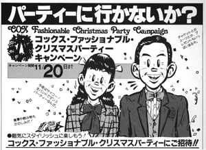 期間中50,00円以上コックスクレジットでお買い物のお客様に(もちろんキャッシュでもOK)、2名様まで入場だきる「コックス・ファッショナブル・クリスマスパーティ」へのご招待券をプレゼントします。また、10,000円お買い上げ毎に補助券を差し上げています。この補助券5枚で、ご招待券と交換できます。
