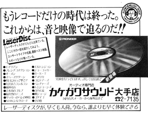 「もうレコードだけの時代は終わった。これからは、音と映像で迫るのだ!」レーザーディスクが早くも入荷!今ならダレよりも早く体験できる。実演を行っています。詳しくは店頭にて。