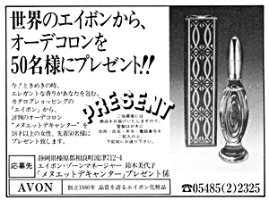 今!ときめきの時。エレガントな香りがあなたを包む。カタログショッピングの「エイボン」から評判のオーデコロン「メヌエットデキャンター」を18才以上の女性、先着50名様にプレゼント致します。