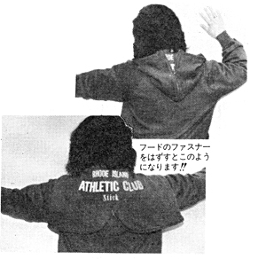 これから夏にかけて、めいっぱい着れるスウェットパーカーは1枚と言わず2枚以上は欲しいところ。COXから新登場したスウェットパーカーは、フードの内側に文字がプリントされている。なぜ内側なのか?フードを背中におろしている時は、ひっくり返っているから内側しか見えない。それをさらにひっくり返えせば、プリントした文字が出てくるという仕掛け。こんな所まで目を付けて考案した人はエライ!しかしそれだけじゃない。さらに、フードのてっぺんにファスナーを付けてしまった。ファスナーを引けば、セーラーカラーに早変わり。プリントが襟に出てくるというわけ。COXではスウェットパーカーの他にトレーナーのオンパレード。新しい色彩のダルトーン(彩度の低い色)やカラフルな色彩の物までビッシリと並んでいる。