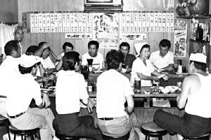 安いをモットーに15年間守り続けてきた「集会処」は夕方5時から7時はサラリーマンで満員の状態。仕事帰りにちょっと一杯というお客さんが多いので夜9時頃には閉店してしまう。昼の食事も4〜500円で十分満足できるそうだから、やっぱり安い。料理は魚類が多く、焼き魚、天ぷら、刺身などに人気が集中している。刺身は450円と、その辺の店で買うより安いと大好評。「人手をかけないで安くしているので、サービスの方はあんまり良くないけどね…」とご主人は笑っていたが、サラリーマンにとって値段が安くてうまければ何ものにも替えがたい。2級酒220円、一級酒280円也。これも安い!