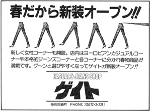 新しく女性コーナーも開設。店内はヨーロピアン・カジュアルコーナーや本格的ジーンズコーナーと各コーナーに分かれ、春物商品が満載です。グ〜ンと選びやすくなってゲイトが新装オープン!