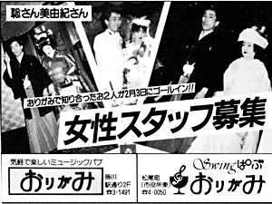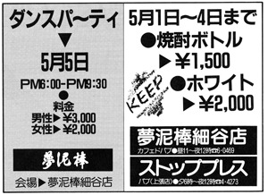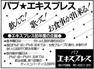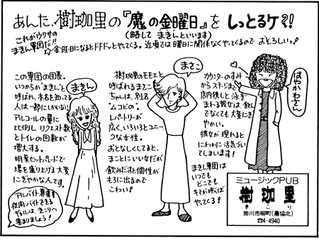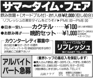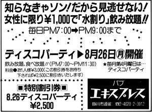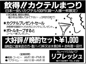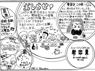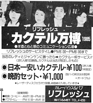 繕わないで歌が楽しめて、酒を酒として飲める。お腹がすいたらお食事もできて…。そして、60年度のう〜んと得する企画も決まりました。その1:毎週木曜日はボトルキープ1,000円引きの日。その2:毎日午後7時〜9時まで女性グループに限り水割り一人千円で飲み放題。その3:毎月第4月曜日午後7時〜11時半まで、三千円で飲み放題、食べ放題。ディスコパーティの日。これらの企画は今年いっぱい続けられます。