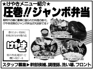 人間の生活の中で食事ほど崇高な行為はない。だから料理はもちろん、食べる環境も重要なポイントとなる。贅沢をすると言うことではなく、楽しく食事をする事を心がけたいものだ。オープンして間もないけやき掛川店では、いつでも活気ある店づくりを目指して2ヶ月に一度キャンペーンを行っている。また、料理も一品の中に少量づつ多種類が入っているメニュー構成なので、一品で何品も食べて様な得した気分にさせてくれる。そして、浜名湖名産のうなぎが入っているうなぎピラフや、超特大の器に盛られたジャンボ弁当、ホットドッグなどのユニークな料理も登場し、一味違った食事が楽しめる。他店にはないユニークなメニューが豊富なのは、常日頃からコックさんが、全国の優秀店やユニーク店に出向いて、勉強しながら独自にアレンジしているからでsる。これからも、年に1回位の割合で、新しいメニューが登場するそうですから、お楽しみに。