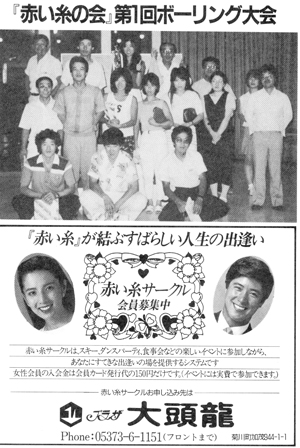 中国には生まれた時から、愛し合う人と右足の小指同士が赤い糸で結ばれているという言い伝えがあります。大頭龍では、この伝説から名付けた「赤い糸サークル」を作り、みなさまに出会いの場を提供しています。スキー、ダンスパーティ、食事会などの楽しいイベントを企画致します。一対一のお見合いの場と違い、仲人の方や周囲に気を使う必要もなく、気軽に参加出来、大勢の中から自分の気に入った相手を選ぶことが出来ます。一度で決めなくてもいいのです。何回か通ううちに愛が芽生えるということもあるし、新しい会員の中から見つかる可能性もあります。ただいま、会員募集中。入会金は会員カード代として150円のみ。各種のイベントは実費で参加できます。お問い合わせはフロントまで