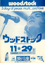 掛川の地において自主的に映画を上映するクラブです。第2回の上映は、あの有名な「ウッド・ストック」に決定致しました。場所は掛川座、11月29日(土)2回上映です。一般は1,000円、会員は無料です。このような有利な会員制にぜひご参加下さい。