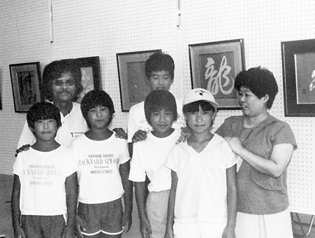 菊川町駅通りの納涼まつりと重なった日は、1,000人から1,200人のお客さんがあったそうで、3日間は連日大忙し。高学年の子ども達が毎日交替で接待に当たっていたが、この日ばかりは「こき使われた」とブツブツ文句を言っていた。しかし、子ども達にとって何よりの体験であった。そして、この作品展は学校や行政が主催するものと違って、型にはまらず、自由に書けるので、子ども達にとっても楽しみな企画のようである。 |