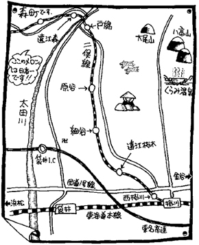 掛川駅にて電車の出るのを待つこと45分。午後2時19分掛川駅発新所原行き。思ったより利用客は多い。しかし、大半は学生が占めている。一駅ごとに乗客が減り、原谷駅を出発するときには、わずかに6〜7人の乗客が残っているのみ。そして、無人駅のホームに電車が滑り込む度に、車掌さんが走っていってはホームの出入り口で切符を受け取っている。そんな光景だけでも。二俣線のあたたかさが伝わってくる。 掛川から豊橋間の見所と言えば、奧浜名湖の周辺くらいでしょうか。たまたまこの日は雨がポツポツ。夕日が湖面に映った風景などを想像すると…今回は見ることができなくて残念でした。全般的に車窓から見る周辺の景色は東海道線となんら変わりはないけれど、二俣線がもつのどかさや、ローカル線のゆったりとした気分を十分味わうことができる。こせこせした毎日を過ごしているあなた。たまには、一日ゆっくりと時間をとって二俣線の旅などいかがでしょうか。 (文:やなせかずこ)