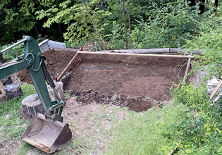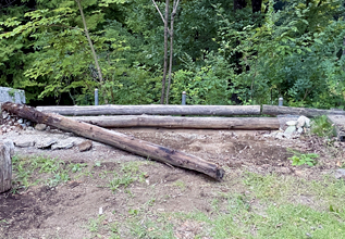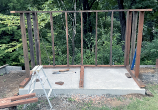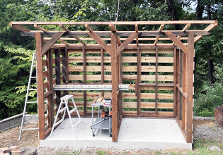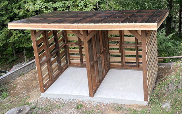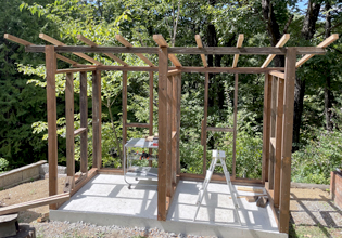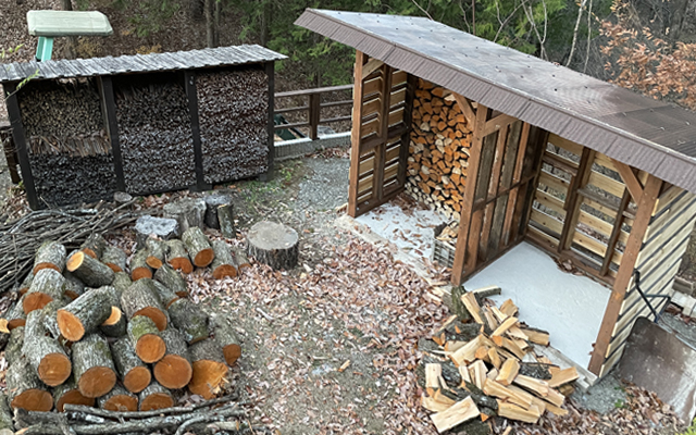 10年位前に作った三番目の薪小屋が傾きはじめ危い状態になってきたので基礎からやり直すことにした。そのまえに薪の移動である。夏場に時間が有るときにこつこつと移動をはじめ作業は1週間掛かった。次は解体作業。庇屋根は腐った所が有ったが丁寧に剥がし、上部の屋根はコンパネ下地だったので重機で吊り下げ降ろしてから屋根板を外した。構造材はコーススレッドで止めてあったが中には折れているネジもあり抜くのに苦労する。解体作業は8月の終わりまで続いた。基礎作りから生コン入れまでは1週間かかり9月始めに終わる。木工作業は解体材の整理からはじまり良い部分を残しながら定寸にカットし組み立てていく。垂木は屋根材が軽いポリカなので細い杉材4.5cm角を購入し、周を囲む杉板も荒材を購入して貼り付けた。今回の薪小屋は木材料の8割ぐらいは解体した古材の再利用でまかなえた。(2024.08.03〜09.25)