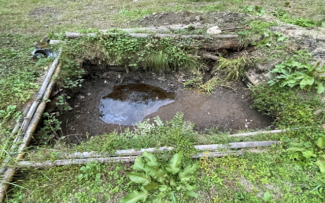 池の大きさは縦が3.5mで巾が2.5m深さ約90cmで、内側は唐松の丸太と石で囲われている。20年以上前に地主さんが作った池だが、記憶によると下や周りにはブルーシートをなどを敷いていたような気がするが今は見えない。10年以上、池の管理はもう誰もやらないが、私が溜まった砂や泥など