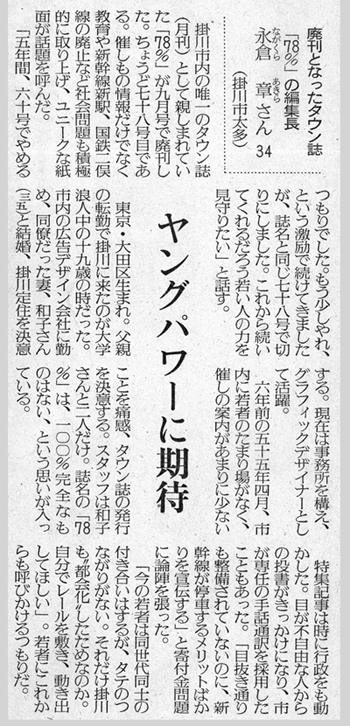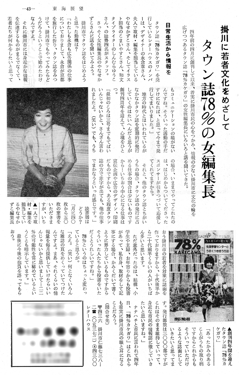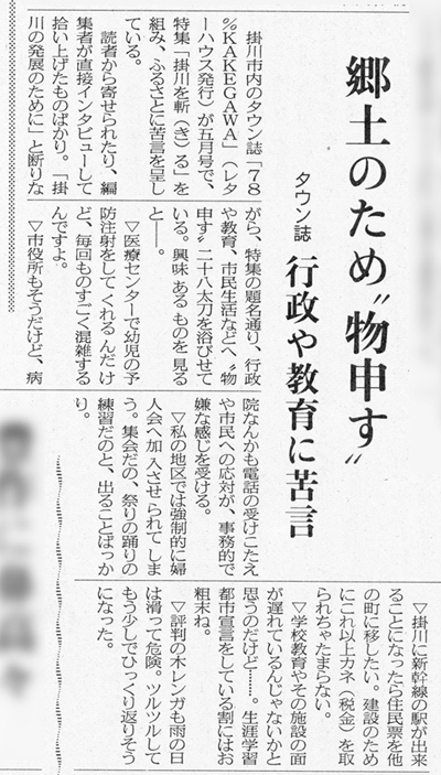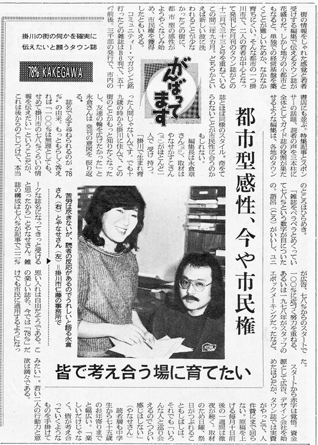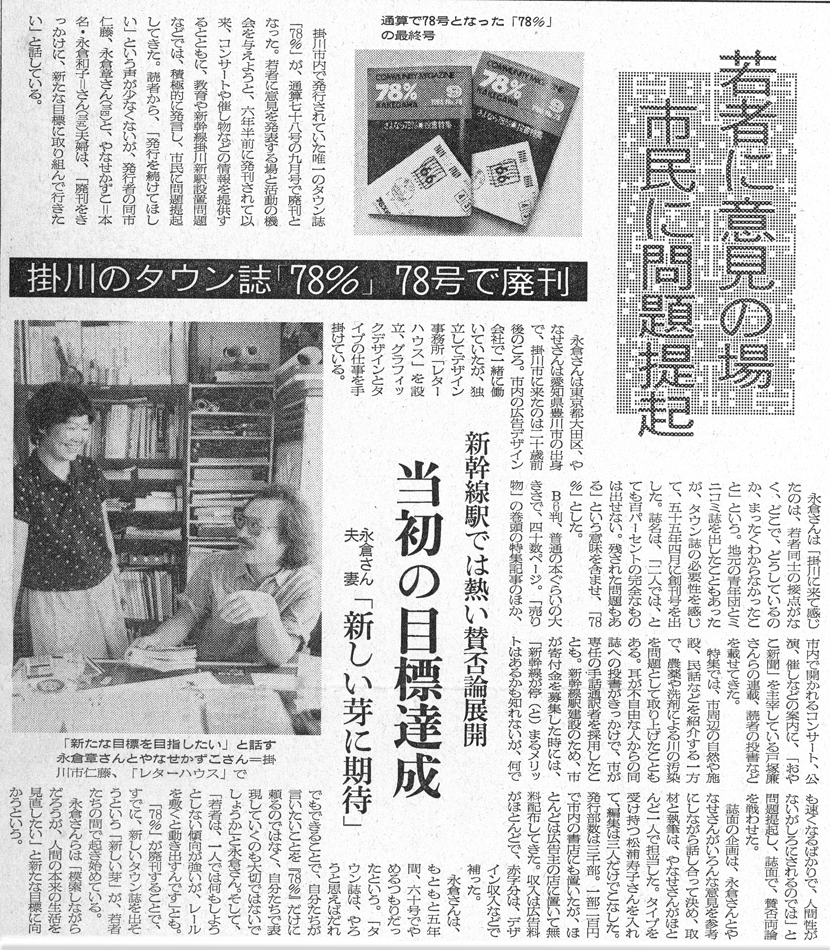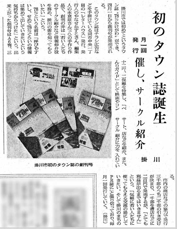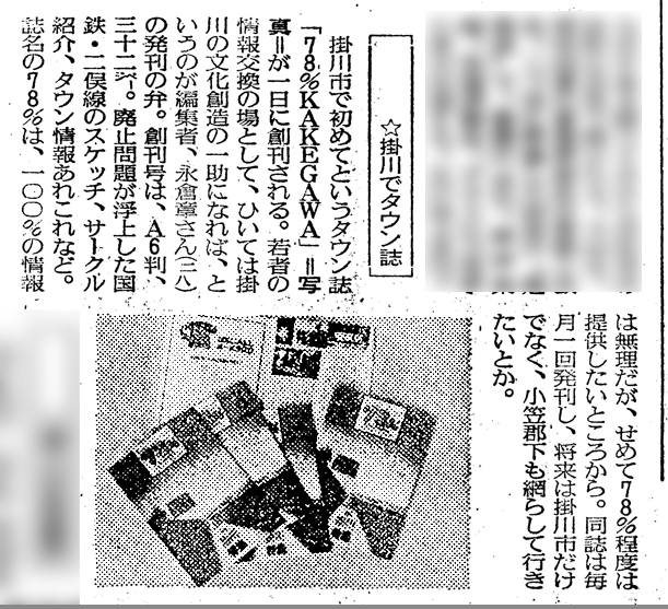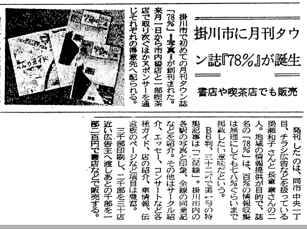 長野県の八ヶ岳に移住する前、静岡県掛川市で市民同士のコミュニケーションを深めるため1980年からタウン誌の出版や、多くの仲間達と若者音楽文化のライブハウス経営や映画上映、イベント、コンサート活動を行っていました。今のようなSNSや携帯電話は無く、その情報発信の中心になっていたのが、私たちのデザイン事務所で発行していた掛川初のタウン誌(コミュニティマガジン)「78%掛川」。市内や近隣の様々な情報源として、若者の交流場所として、市制への行政批判、宣伝広告媒体としても多くの商店や会社に応援を頂いた。そのような広告中心では無いどこの組織にも属さないタウン誌は今までなかったため、各メディアに注目され、取材され紹介されました。