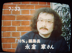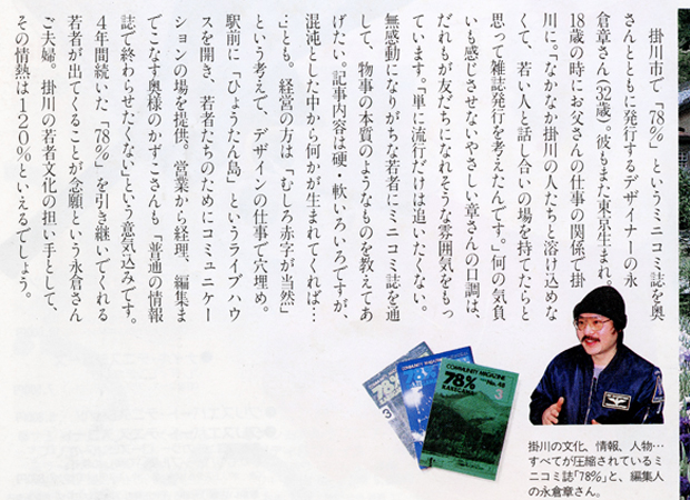 今まで世間に顔をさらすことが無かった編集長がついにそのベールをぬいだ。NHK「きょうのリポート」で78%が紹介されました。数ある中から選ばれたそうでまことに光栄である。「78%には暖かみがある」とのありがた〜いお言葉もいただきました。地域のコミュニケーションを大切にしてきたかいあって、ようやく日の目を見ることができました。最初は出演を渋っていた編集長も意外な反響にビックリ。「ひとりでも多くの人に知ってもらえたことは、今後のプラスになった。読者のみなさんのタウン誌であるとともに、もっと多くの人々に利用してもらいたい。」と切なる希望を抱いて、日夜張り切っています。これからも一歩ずつ前進しながら 、掛川の街に根をおろしていきたいと思っています。